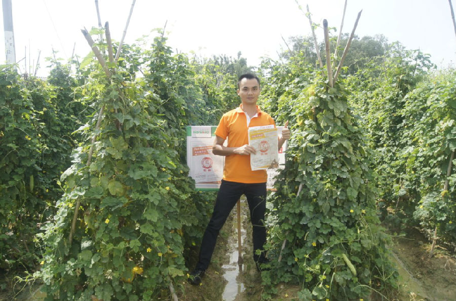 示范效果:示范田苦瓜葉片厚綠、花期不落花,掛果多,果實膨大快,果型均勻,抗病性強使用后能延長一個月的采收期,畝增產1500斤。