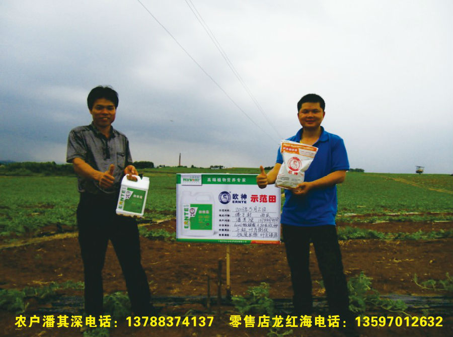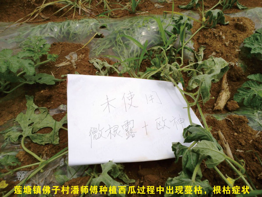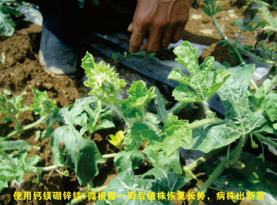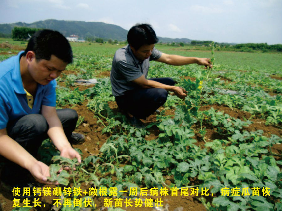 效果:橫縣蓮塘鎮(zhèn)佛子村農戶潘其深種植西瓜60畝,將近十年的西瓜種植經(jīng)驗,是當?shù)匾晃挥杏绊懥Φ睦蠋煾怠5鼇恚灿龅叫┬氖隆T鐜啄暧捎诨蕿E用,造成當?shù)赝临|普遍肥力下降,土壤環(huán)境惡化,直接造成了種植西瓜易出現(xiàn)土層病害引起的蔓枯,根枯等癥狀,農戶們換了很多產品,也沒能對這些病害起到特別的療效,只能看著西瓜藤枯萎,最后甚至絕收,更令人心寒的是,這種癥狀在橫縣西瓜種植中,很常見!潘師傅的西瓜地今年也受到了根枯癥狀的影響,不少西瓜藤干枯,倒伏,葉片枯萎,正愁又像往年一樣又要損失不少,經(jīng)當?shù)亓闶鄣昀习妪埣t海介紹,使用上海漢和鈣鎂硼鋅鐵+微根露的組合配方,抱著試一試的態(tài)度,于5月2日以“微根露60ml+歐神鈣鎂硼鋅鐵60g”/桶做淋根處理。5月6日對病株觀察時,發(fā)現(xiàn)超過70%以上病株竟然神奇地“站起來”了!!葉片厚綠,苗向前伸,不再倒伏,潘師傅看到了轉機。5月9日再次做跟進時,病株已發(fā)新苗,長勢得到了恢復,與旁邊未使用“鈣鎂硼鋅鐵+微根露”的西瓜有了非常明顯的對比,一邊是枯萎,一邊是葉片青綠!潘師傅很激動,對在場包括零售店,其他農戶在內的觀摩人員表示,“從前遇到類似根枯的情況,都很難治,這次用漢和的產品,真正的解決了我這里西瓜根枯的老大難問題!!”,周圍一同觀摩的農戶看到這效果,當場決定先購買一套組合產品使用!并在技術人員的指導下合理分配使用量。零售店蘇經(jīng)理表示“通過觀摩產品效果,并看到潘師傅的喜悅心情,現(xiàn)在對漢和生物產品越來越有信心了!今后為了西瓜健康生長,主推歐神鈣鎂硼鋅鐵+微根露!”