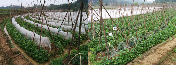 圖1.2014年2月-3月中上旬南寧連續遭遇低溫陰雨天氣,3月底天氣開始好轉,但未使用微根露的茄子地還需用薄膜覆蓋,植株長勢弱且參差不齊;而使用微根露的地塊已經可以揭膜,且葉片厚綠,植株長勢良好,已經有花蕾出現。