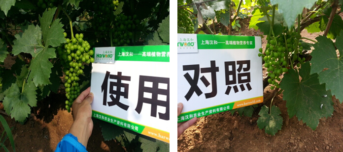 效果:噴放兩遍歐護后果粒表面光澤度發,葡萄果柄處比較粗壯,果粒平均個頭要大;葉片濃綠、柔軟,特別沒有表現出缺鎂癥狀。而沒有噴施歐護的葡萄表光不亮麗,個頭較小,葉片光澤度差一點、比較脆、粗糙。