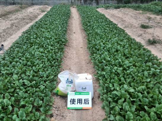 結果:如圖所示,兩塊地無死苗、爛根、黃葉等現象,菜心生長整齊,長勢良好,說明普滋露、普滋素400倍稀釋液已經可以達到預防死苗、爛根的作用。