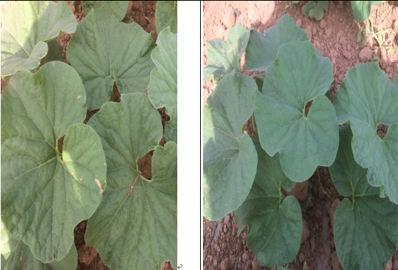 (右邊試驗區的葉片相比左邊對照區,更濃綠、厚實)