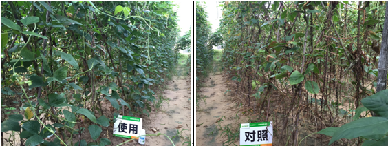 2015年8月3日持續(xù)半個月的雨水過后,對照組未使用因卡波的豆角長勢較弱,黃葉落葉較多,使用了因卡波的豆角整體長勢仍然較好,植株下部老葉仍然保持鮮綠,且葉片比未使用的葉片要厚綠。 | |