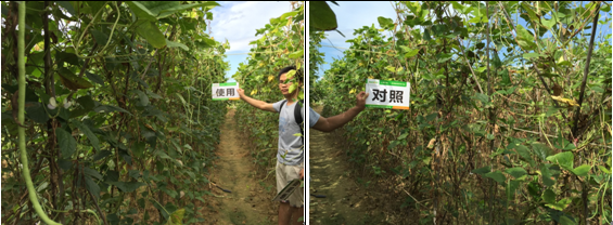 2015年7月19日豆角處于生長旺期,已使用因卡波的豆角長勢較好,整體結(jié)的豆角比較均勻。未使用的對照區(qū)長勢不差,所結(jié)豆角沒有使用因卡波的均勻。 |