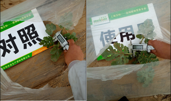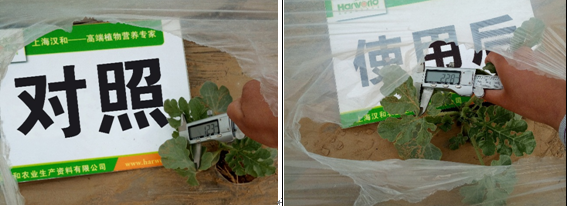 效果說(shuō)明:使用8天后西瓜葉柄平均粗度達(dá)3.188mm,比對(duì)照組平均粗度粗0.75mm,養(yǎng)分和水分輸送渠道更多,吸收當(dāng)然更好。